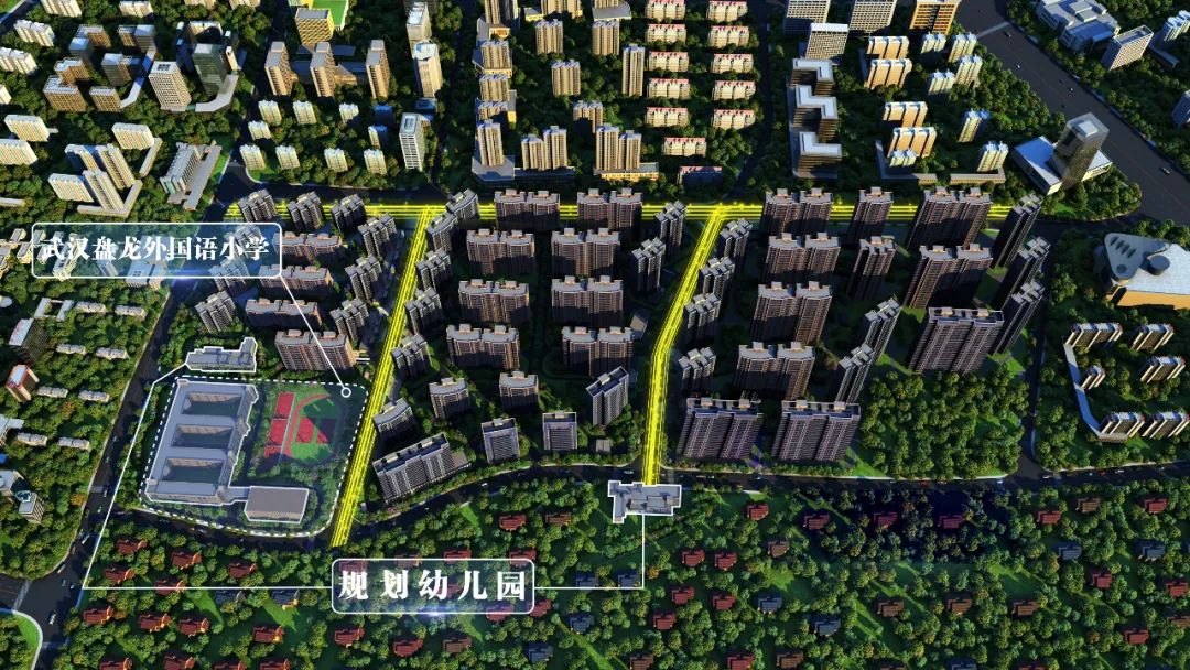 項目內部規劃有兩所幼兒園及武漢盤龍外國語小學,另項目西側直線距離約500米左右有省重點高中黃陂一中盤龍校區,全齡教育一步到位。